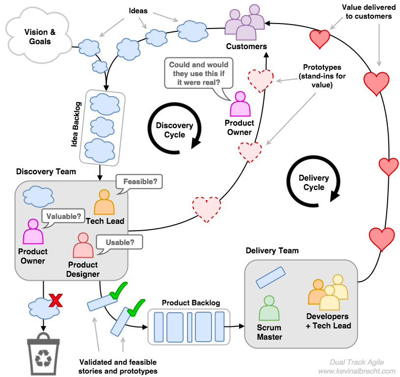 Por acaso, acabei encontrando um post no medium do Kevin Albrecht, onde ele detalhou o que ele chamou de Dual Track Agile: Focusing on Customer Value (Focando no valor para o cliente) e foi onde eu encontrei essa imagem que mostra o fluxo de trabalho como um todo